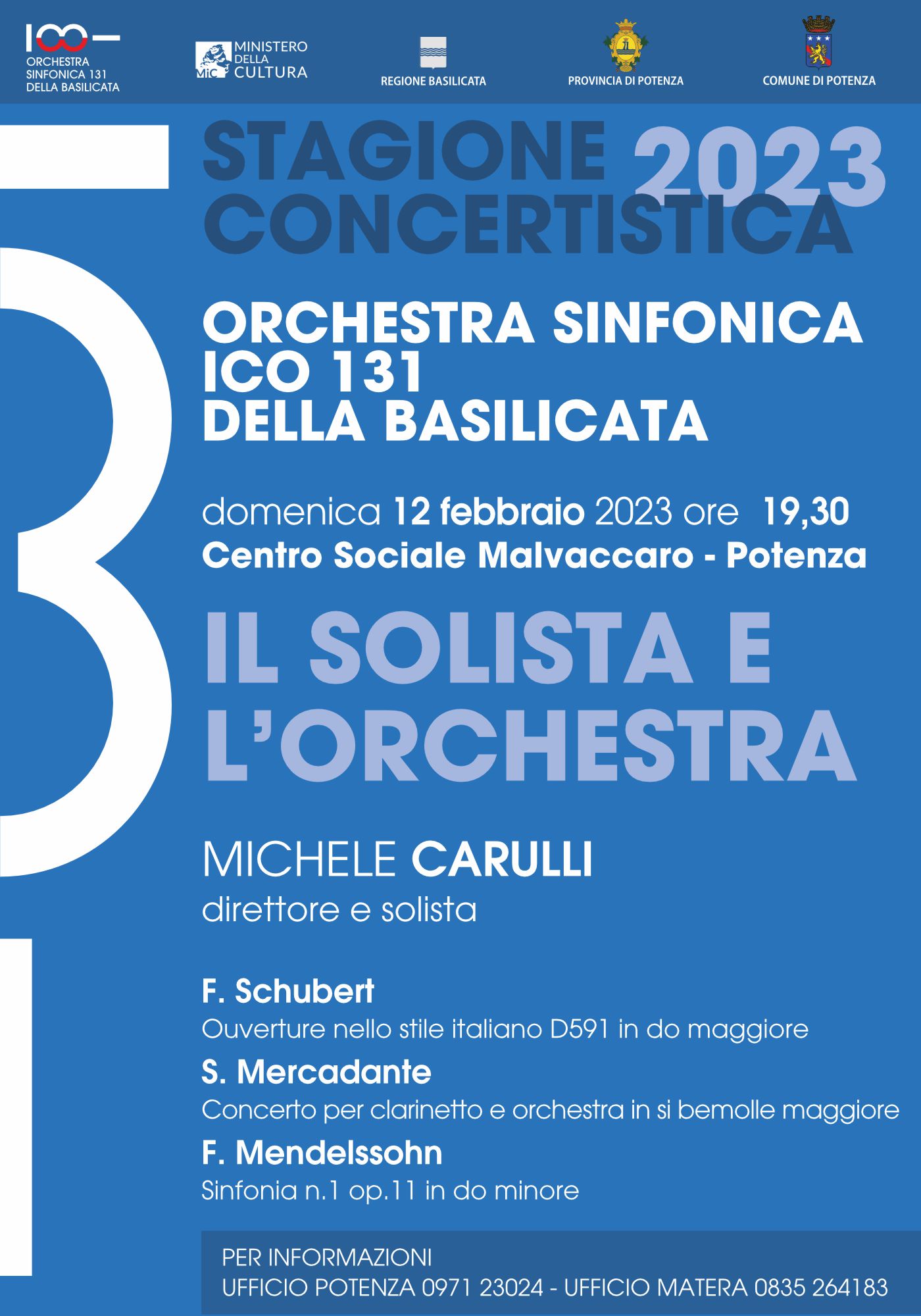 Centro Sociale Malvaccaro - Potenza PotenzaSTAGIONE CONCERTISTICA 2023 ORCHESTRA SINFONICA ICO 131 DELLA BASILICATA Domenica 12 febbraio 2023 ore 19,30 Centro Sociale Malvaccaro - Potenza IL SOLISTA E L’ORCHESTRA MICHELE CARULLI direttore e solista F. Schubert - Ouverture nello stile italiano D591 in do maggiore S. Mercadante - Concerto per...